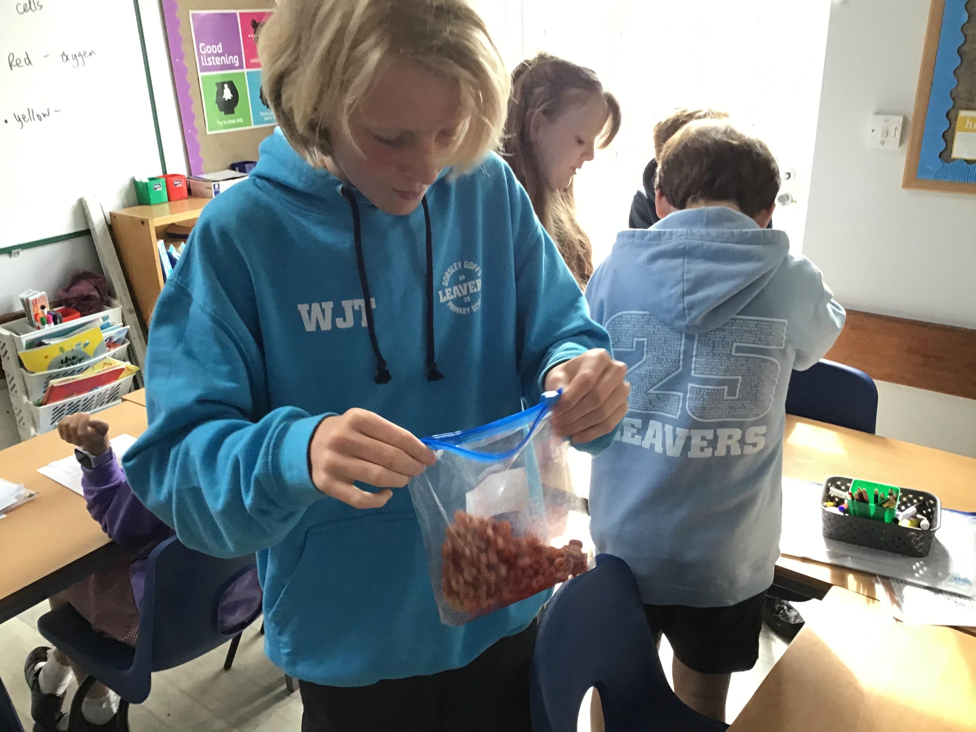 We spent a day discovering the components that make up our blood. We learnt that each component has an important function and that these altogether make our blood brilliant. Then, we made our own 'blood' to help us remember these different components and their function. We use Cheerios and red food colouring to represent the red blood cells, we used yellow food colouring to represent the plasma and white mini marshmallows to represent the white blood cells. Finally we used pink mini marshmallows to represent platelets.