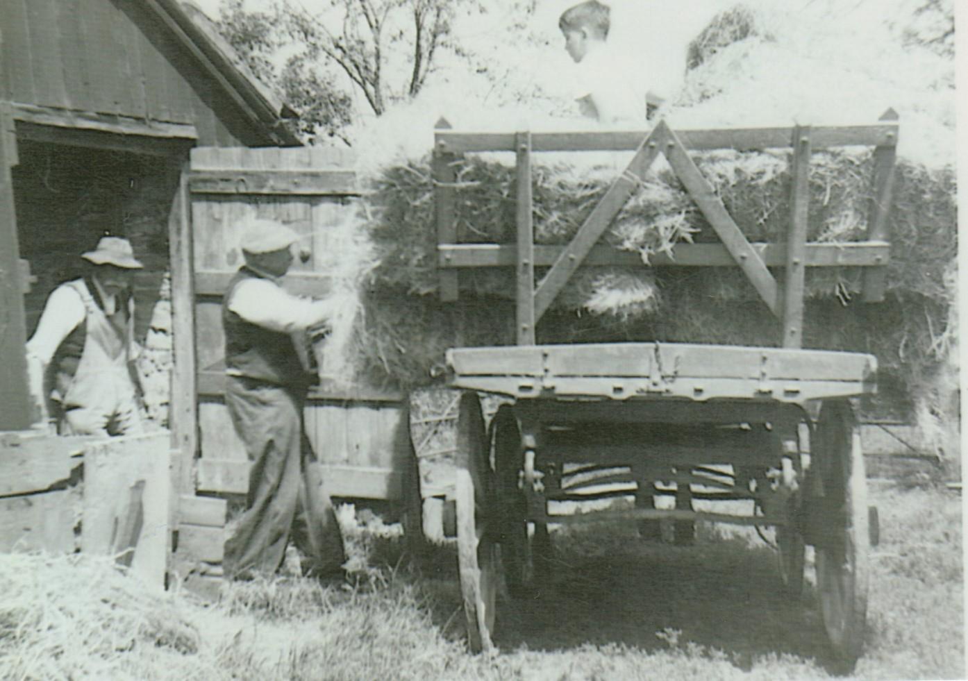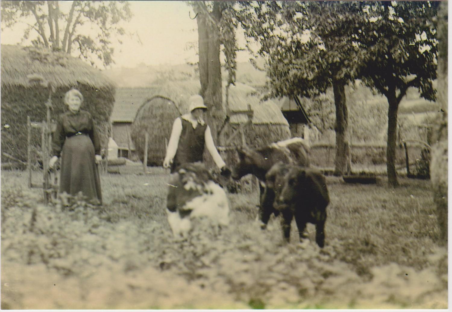 Mr Clifford had an orchard with cherry trees, plum trees and cider fruit. There was a cider millhouse where the large stone mill and cider press were installed and where he kept all the barrels of alcohol. Usually the cider and perry fruit was knocked down with long panking poles, but long ladders were used to pick the other fruit. When the cherries were ripe he had to scare the birds off the trees every morning. Grass was cut with a scythe and stored in ricks which were thatched with straw to keep them dry. The hay was used to feed the horse and animals in winter. (Two ricks are seen in one photo.) He extended his wain house to provide cover for the cart and waggons. When he carried buckets of water from his well for the animals, he often used a yoke.