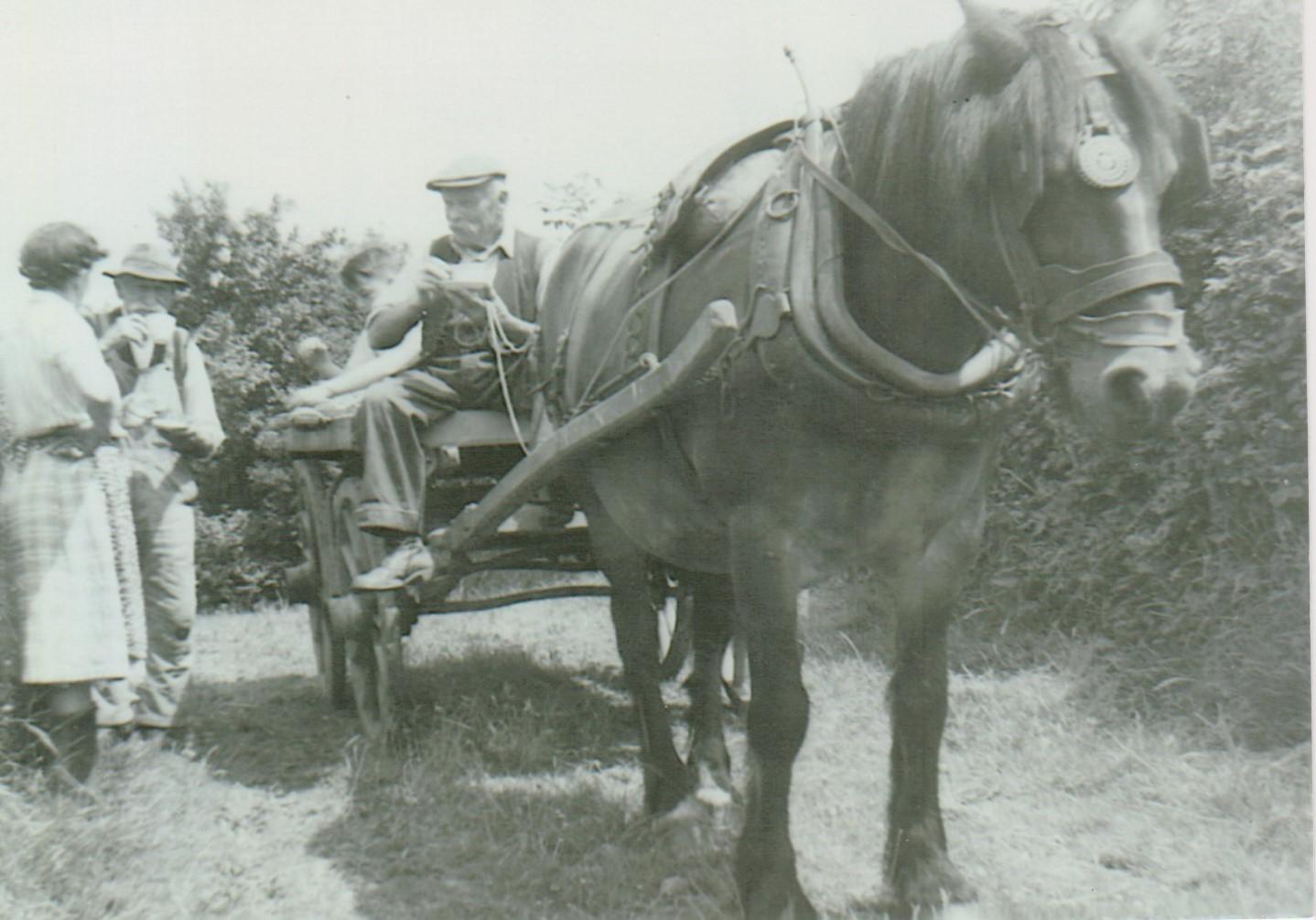 Mr Clifford worked on a farm in Aston Ingham for Mr Brooks until 1939 when his employer retired and came to live in Gorsley. In addition Mr Clifford ran his small holding at White House in Gorsley. They were not the owners of the house and land, but they had free use of it. He kept a cow and a few calves and the couple made their own butter in a large churn for there was plenty of milk. He kept sheep and reared pigs. A pig was killed for bacon each year. The wall where they salted the bacon still gets damp. He kept poultry so they had eggs and chicken meat. He was a carpenter and knew how to make cart wheels - a skill he had probably learned from his neighbours who were wheelwrights. In one photo he is making new shafts for his cart. He did many odd jobs around the village using his horse and cart. At the chapel he dug graves out of the hard stone and mowed the grass. At Goffs School he emptied the toilet buckets.