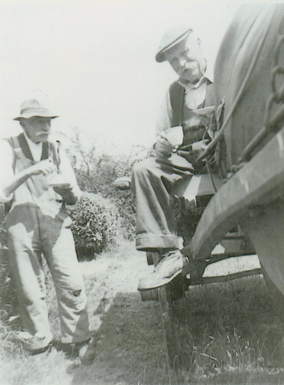 Mr Clifford had an orchard with cherry trees, plum trees and cider fruit. There was a cider millhouse where the large stone mill and cider press were installed and where he kept all the barrels of alcohol. Usually the cider and perry fruit was knocked down with long panking poles, but long ladders were used to pick the other fruit. When the cherries were ripe he had to scare the birds off the trees every morning. Grass was cut with a scythe and stored in ricks which were thatched with straw to keep them dry. The hay was used to feed the horse and animals in winter. (Two ricks are seen in one photo.) He extended his wain house to provide cover for the cart and waggons. When he carried buckets of water from his well for the animals, he often used a yoke.