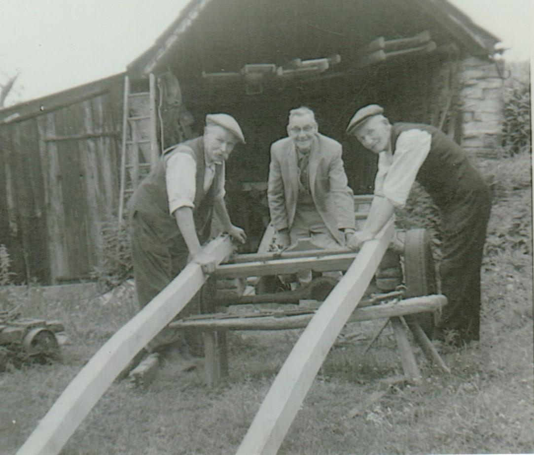 Mr Clifford worked on a farm in Aston Ingham for Mr Brooks until 1939 when his employer retired and came to live in Gorsley. In addition Mr Clifford ran his small holding at White House in Gorsley. They were not the owners of the house and land, but they had free use of it. He kept a cow and a few calves and the couple made their own butter in a large churn for there was plenty of milk. He kept sheep and reared pigs. A pig was killed for bacon each year. The wall where they salted the bacon still gets damp. He kept poultry so they had eggs and chicken meat. He was a carpenter and knew how to make cart wheels - a skill he had probably learned from his neighbours who were wheelwrights. In one photo he is making new shafts for his cart. He did many odd jobs around the village using his horse and cart. At the chapel he dug graves out of the hard stone and mowed the grass. At Goffs School he emptied the toilet buckets.