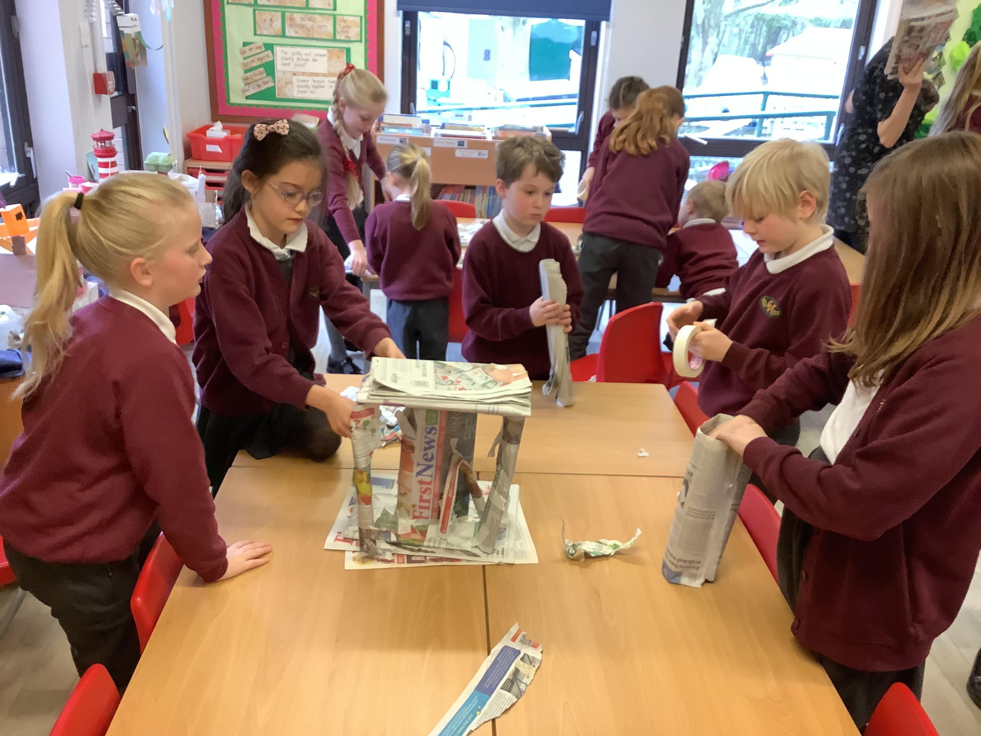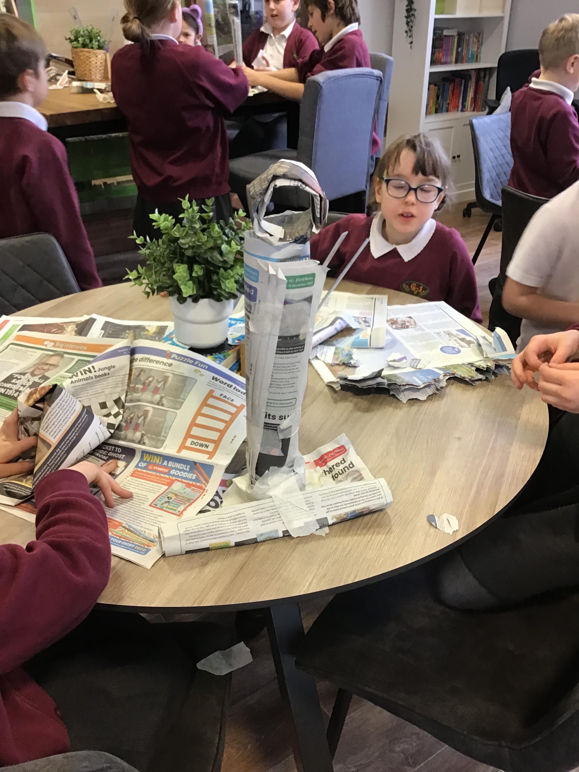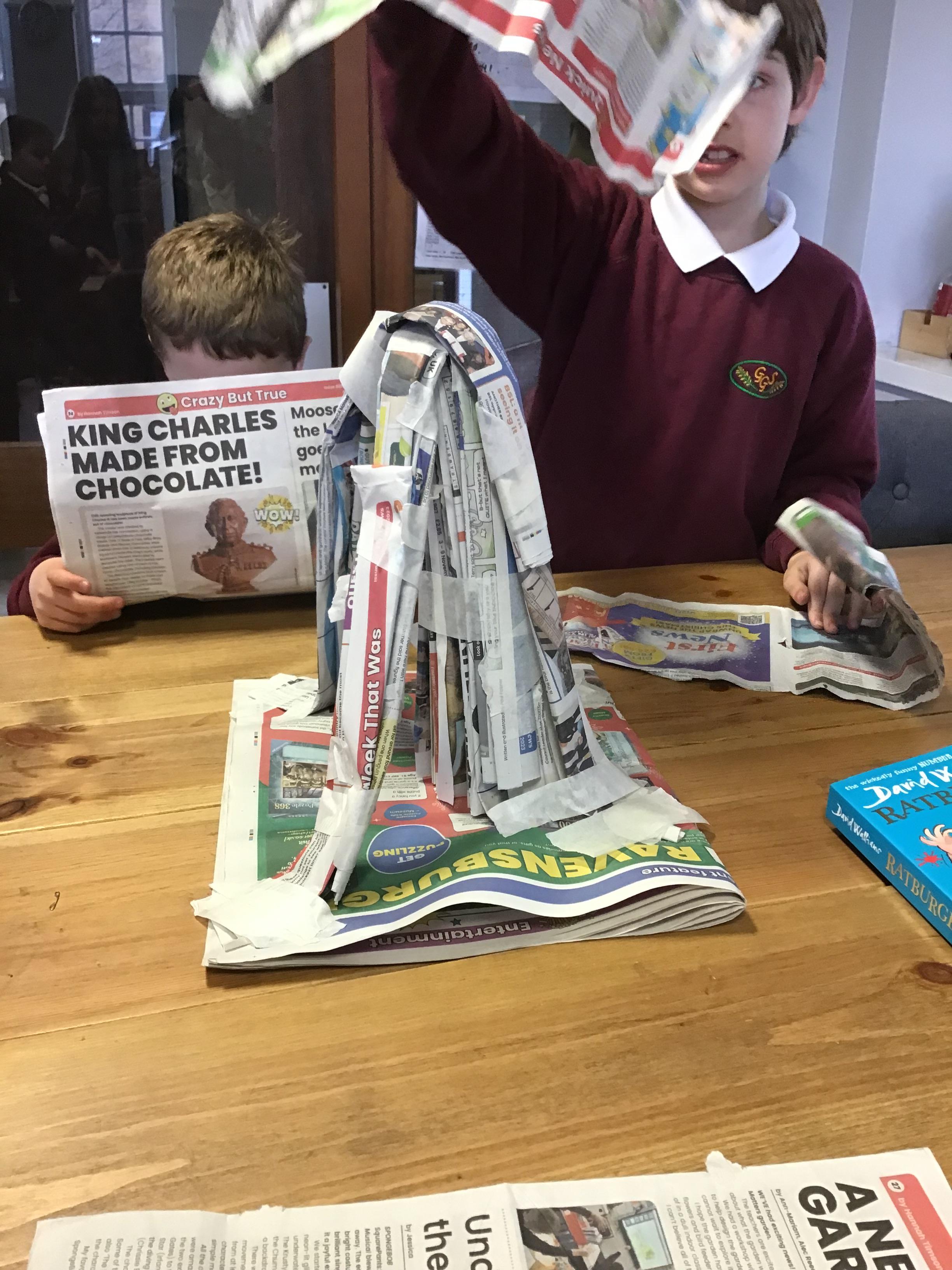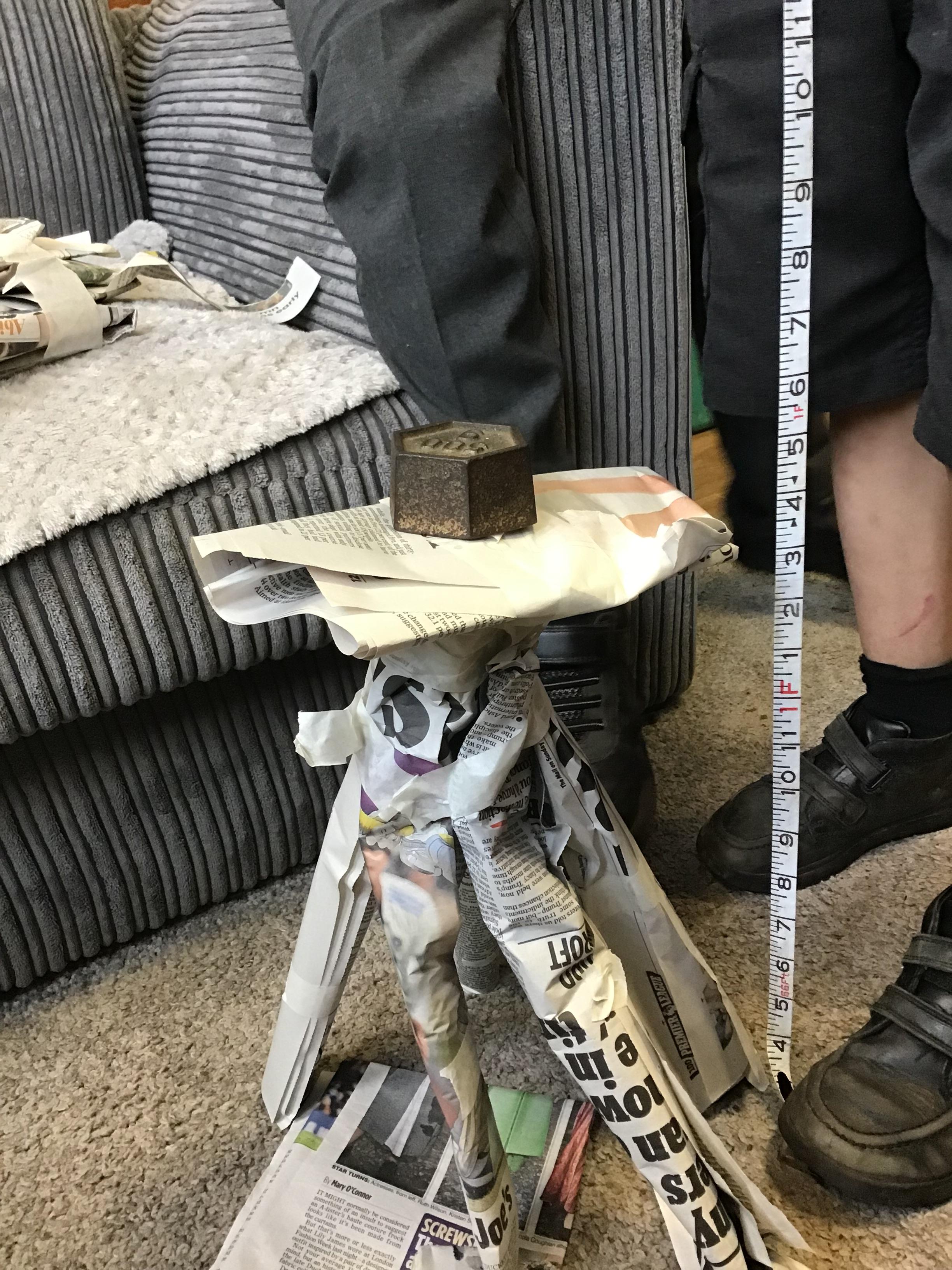 We built towers out of newspaper, as tall as possible, that could hold a 500g weight for 30 sec