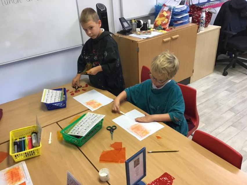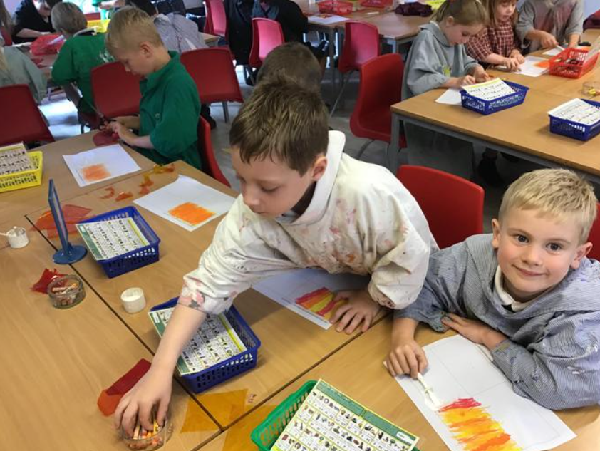 The children explored fiery colours using a variety of media in preparation for creating their pictures.