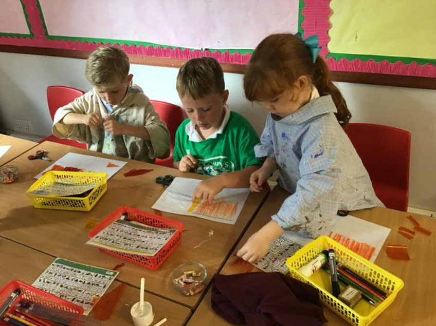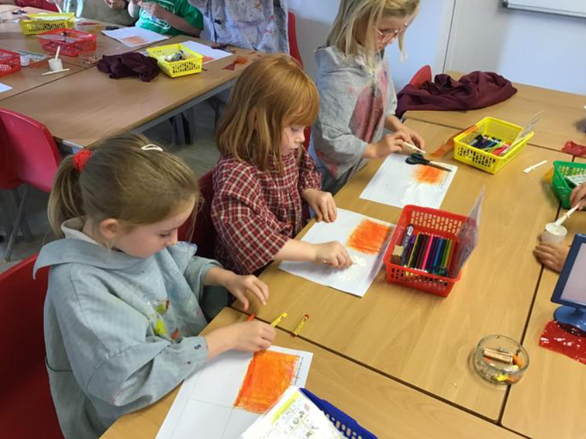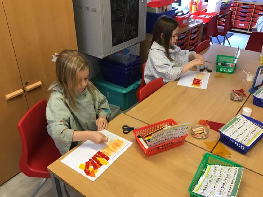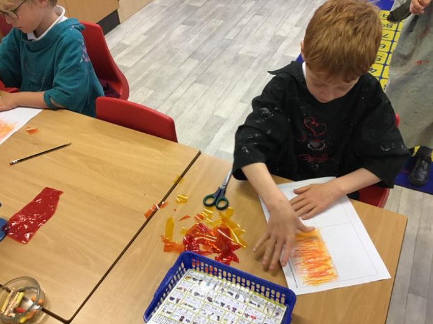 The children explored fiery colours using a variety of media in preparation for creating their pictures.