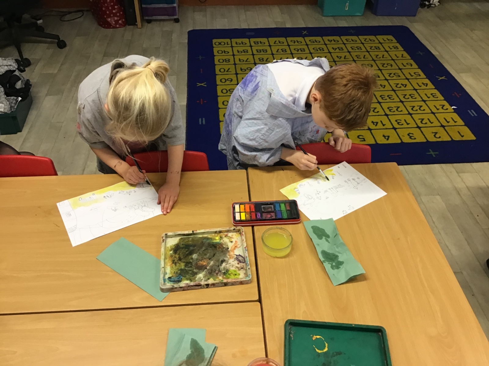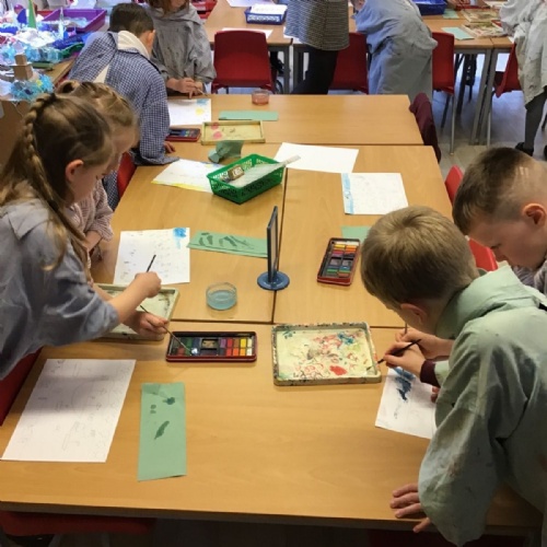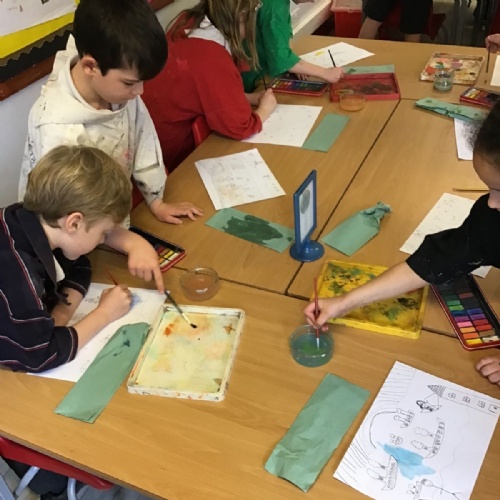 Firstly, the children practised mixing secondary colours from the primary colours using watercolour paints. Then they worked on making their colours lighter using white and darker using black.