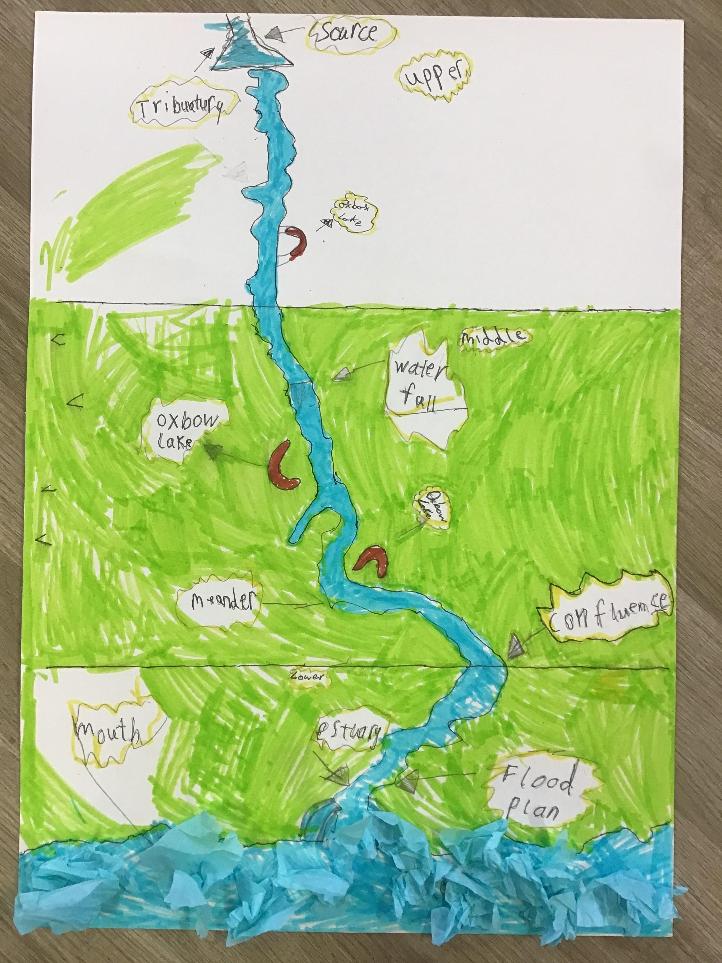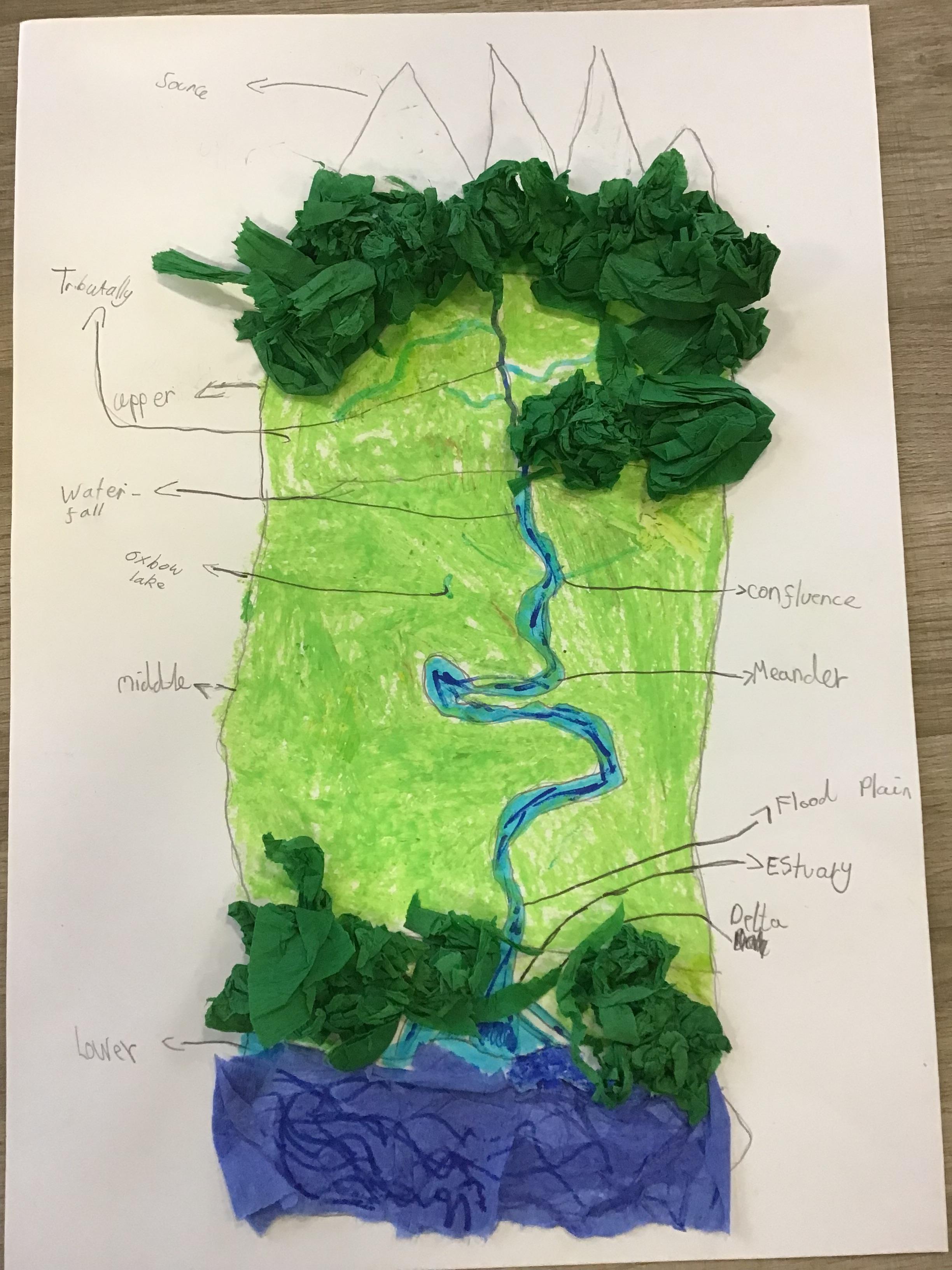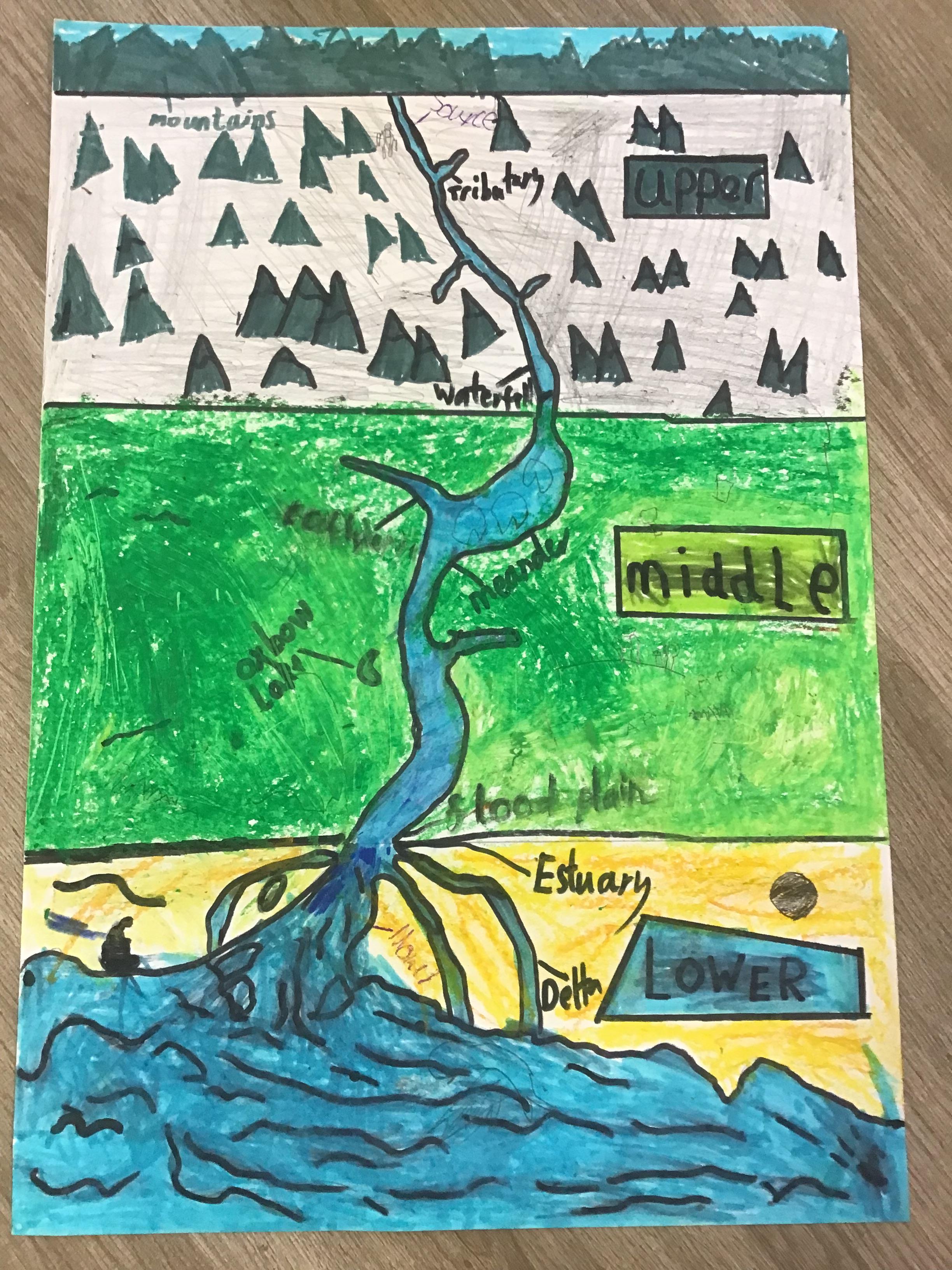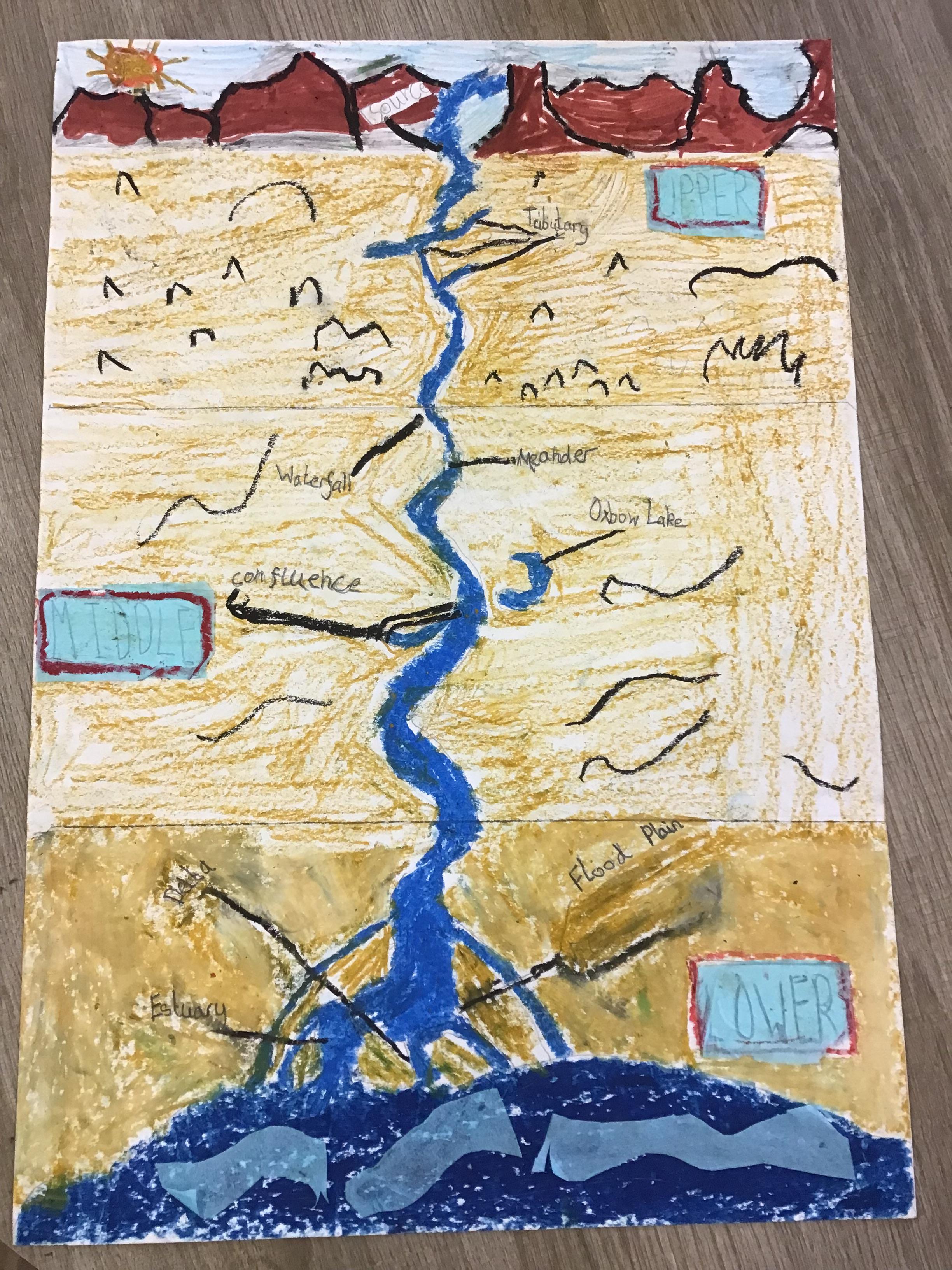 Geography ️ - In Geography we have been exploring rivers and recapping the water cycle. We have learnt how rivers are formed and the names of their key features. We used maps to identify the main rivers found within the UK and noticed that most sources started inland and on high ground and that their mouths led out to sea or another river. Test us on our knowledge!